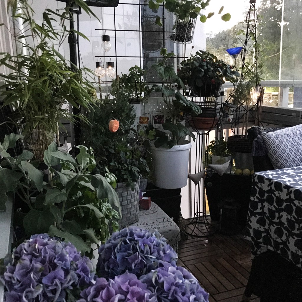 Börjar morgonen med en status av det som växer på balkongen. Troligen årets sista jordgubbe. Femte gurkan färdig att skördas detsamma tror jag att det är med auberginen men den får hänga med några dagar till. Fjorton omogna tomater på en för övrigt risig planta. Jag kom ju igång väldigt sent med frösättningen men nu växer plantorna fint. De kommer troligen inte hinna sätta frukt men jag får njuta av deras växtkraft. Hortensians blad är så gröna och fina och jag har låtit blommorna vara kvar hela sommaren även om de övergått från en lila färg till ljusgrå. Finns en charm i att de inte vissnar helt.