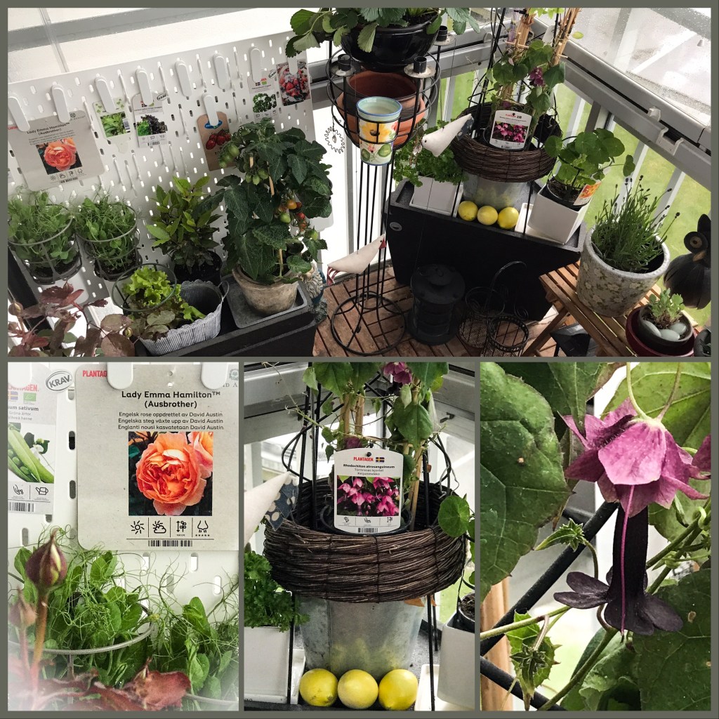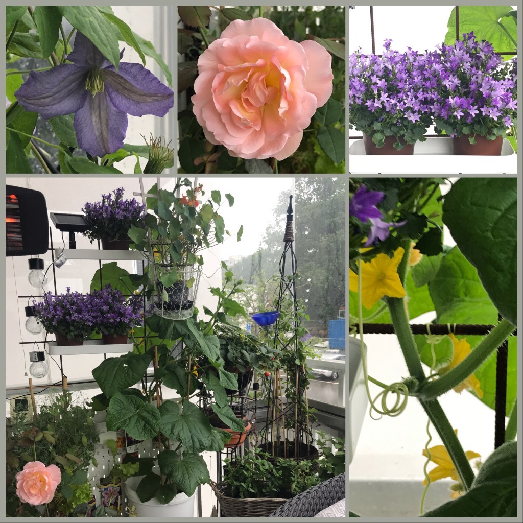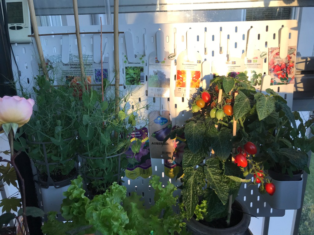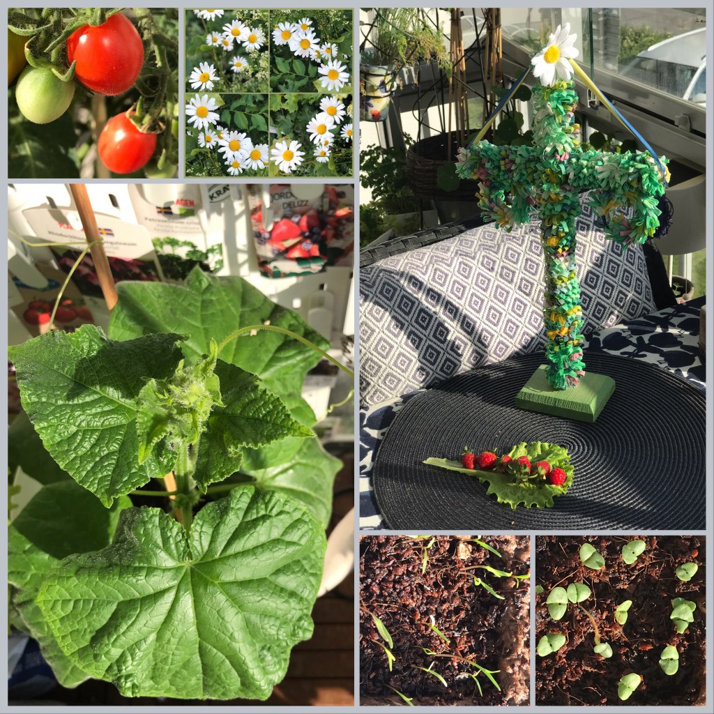 Växterna på balkongen är i ständig rörelse. De som stått på tillväxt kommer fram som krassen. Den har börjat sätta knoppar. Klätterväxterna måste få en plats som ger dem utrymme att växa och klättra, innan de förankrat sig på platsen. Ärtplantorna har fått sina första små ärtskidor, som gör mig glad. Gurkan med sina gula blommor går inte att flytta på längre, den har bestämt sig för var den vill vara.Tomaterna står ljust på bordet. Har bytt plats med ”Törnrosas kjortel” som hamnat vid väggen. Så här pågår arbetet med att skapa optimala förutsättningar för växterna.