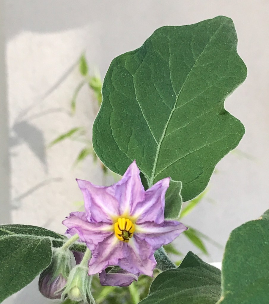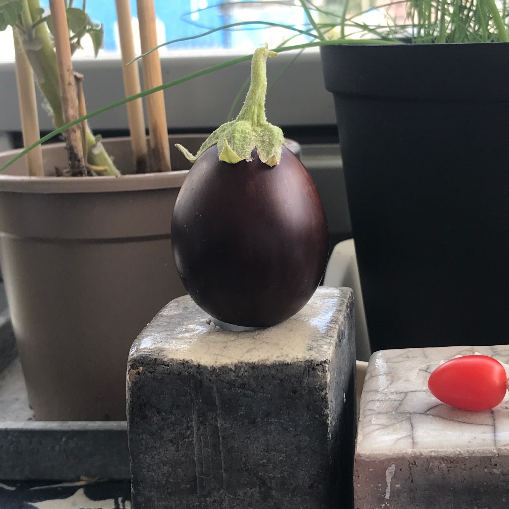 Att ta närbilder, att krypa riktigt nära växter och blommor, öppnar helt nya rum. Jag har köpt färdiga plantor, olika sorter, som jag ska försöka sköta om efter bästa förmåga här på balkongen i sommar. När jag tittar närmare på en aubergine som flyttat in ser jag till min förtjusning att den redan har två välutvecklade frukter.