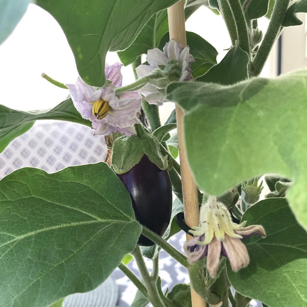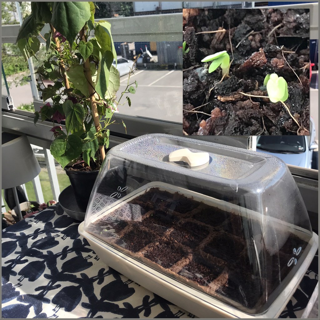 Sneglar på mina auberginefrukter. När ska jag våga skörda? Nya blommor och förhoppningsvis frukter ser lovande ut. Tittar vidare nyfiket i miniväxthuset som barn brukar göra när frön är satta för att gro. Det är två dagar sedan jag planterade diverse frön. Och ser man på, lite grönt tittar fram.
