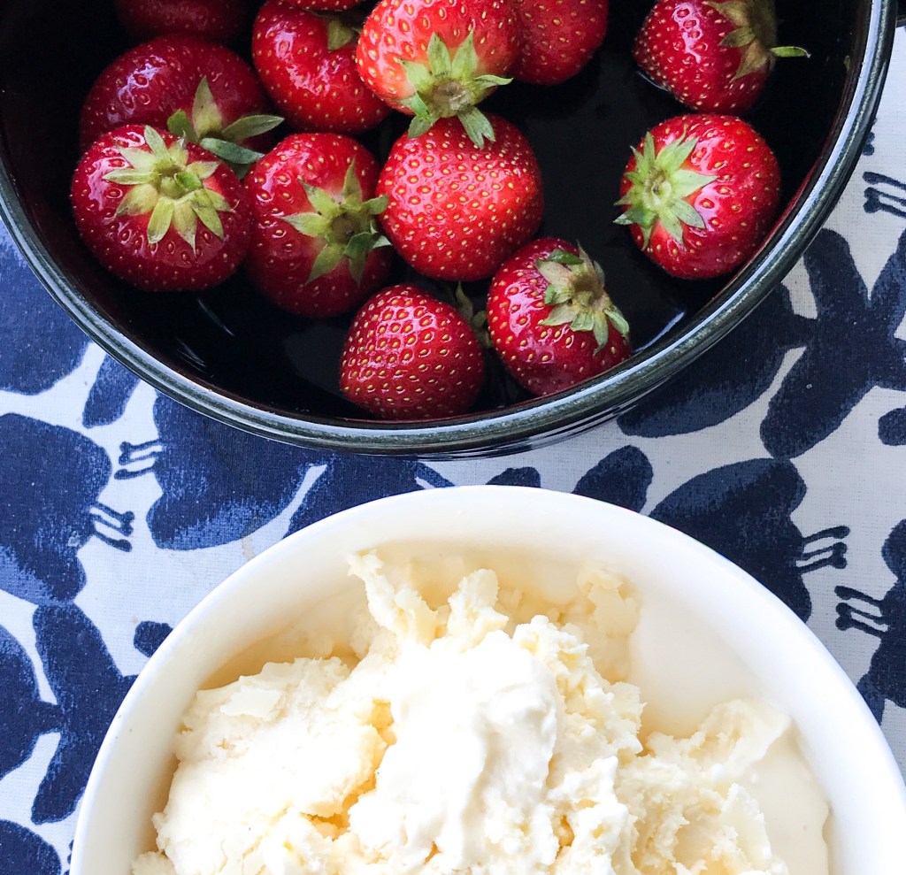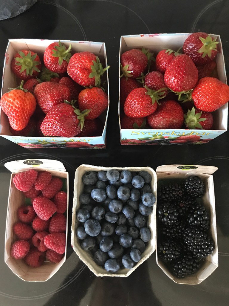 Nu njuter jag av jordgubbar och hemlagad vaniljglass. Vi blev båda överraskade att det blev så gott och jag att det gick så bra att göra den i en liten billig glassmaskin. Det gäller att planera i förväg. Skålen ska stå i frysen 24 timmar innan tillverkning. Själva glassen ska stå i 4 timmar i kylen innan den hälls ner i den förfrysta skålen. Sedan bearbetas glassen med en långsam visp och den blev klar fortare än jag väntat mig. Nästa försök är en Kiwisorbet. Jordgubbarna är inte egen odling utan inköpta hos entreprenörerna som säljer bär vid vägkanten.