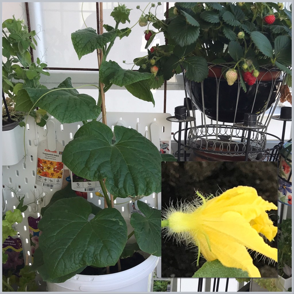 Visst är det varmt ute men jag har inte solsting. Jag har fått tid att noggrant studera plantorna på balkongen. Och nu följer jag intresserat varje fas av min gurkplanta. De stora bladen fungerar som parasoller för de gula vackra blommorna vid stammen. Framöver även för gurkorna hoppas jag. På en bild syns gurkplantans fjädrande upphängningsanordning av chassit. Känns som om jag idkar industrispionage på gurktillverkning.