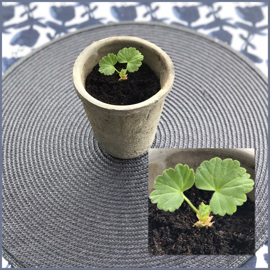 Förra året hade jag få växter. Köpte en pelargon Mårbacka XXL som glänste i full prakt och tog mycket plats. Jag tog inte vara på den i höstas utan pelargonen har fått övervintra på den inglasade balkongen och vissna ner totalt. Men ett pyttelitet grönt skott mitt i den för övrigt knastertorra växten hittade jag vid vårstädningen av balkongen. Nu gör jag experimentet med skottet för att se om det vill växa.