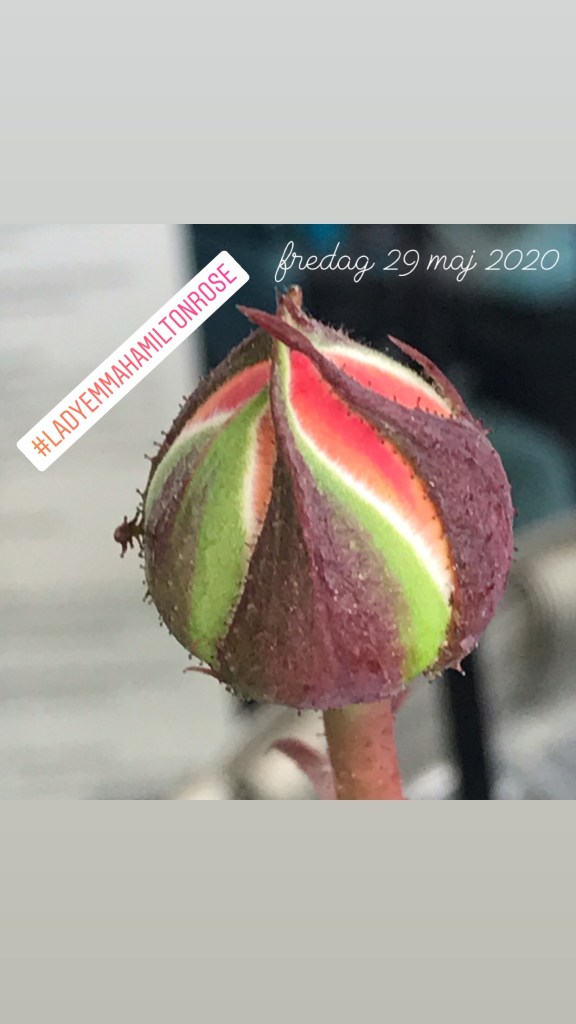 Rosen Lady Emma Hamilton har varit en stor överraskning. Den har efter den första blomningen återkommit med fler blommor under hela sommaren. Nu är tre nya knoppar på gång. Så elegant och med en ljuvlig diskret doft som det anstår en lady. Nu gäller det att jag lyckas med att övervintra rosen.