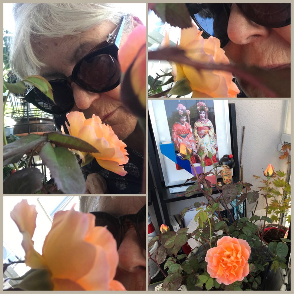Vaknar tidigt. Styr mina steg till balkongen för att titta till min miniträdgård. Där står den, fullt utslagen, rosen, Lady Emma Hamilton, den bländar mig. Doftar ljuvligt men hur delar jag upplevelsen till mina vänner. Det får bli några bilder som visuell kommunikation.