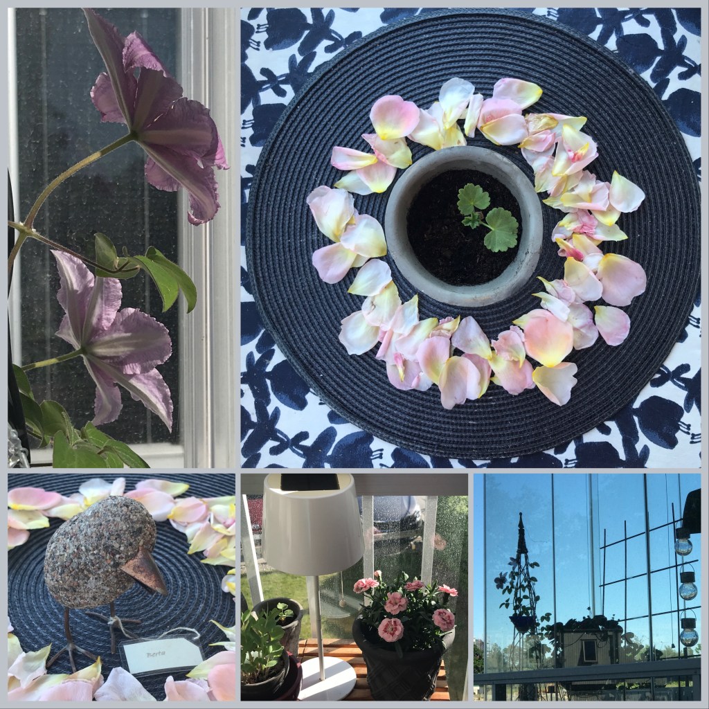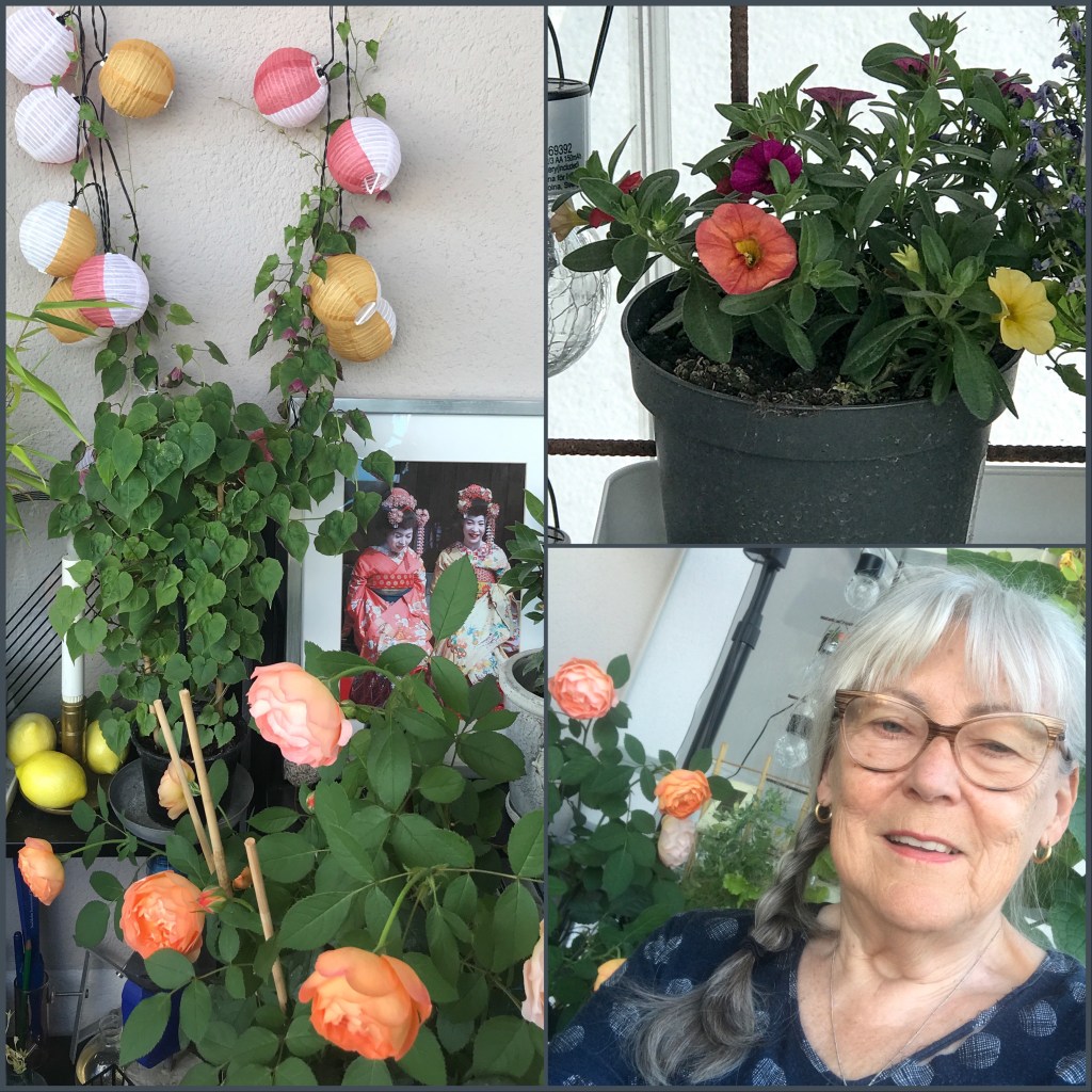 Hemma blir det festlig middag på balkongen omgiven av ett växande sällskap av blommor och trädgårdsväxter. Att utsikten från balkongen är en enorm byggarbetsplats går att komma över när den närmare miljön hela tiden får mig på gott humör, men också kallar på uppmärksamhet och omsorg.