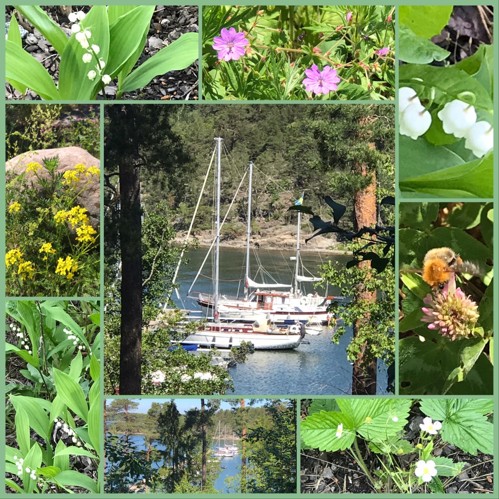 Många midsommarfirare var på väg ut från staden mot Värmdö, när vi åkte ut till Artipelag för att hämta vår midsommarkasse med mat. På vägen hem hade de mötande köerna vuxit nästan ända till Södertunneln. Ingen bra början på midsommarfirandet. Förutom den goda maten bjöd Artipelag på underbar natur och vackert väder. Fotograferade blommor till min digitala midsommarbukett. Hittade både smultronblommor och liljekonvaljer.