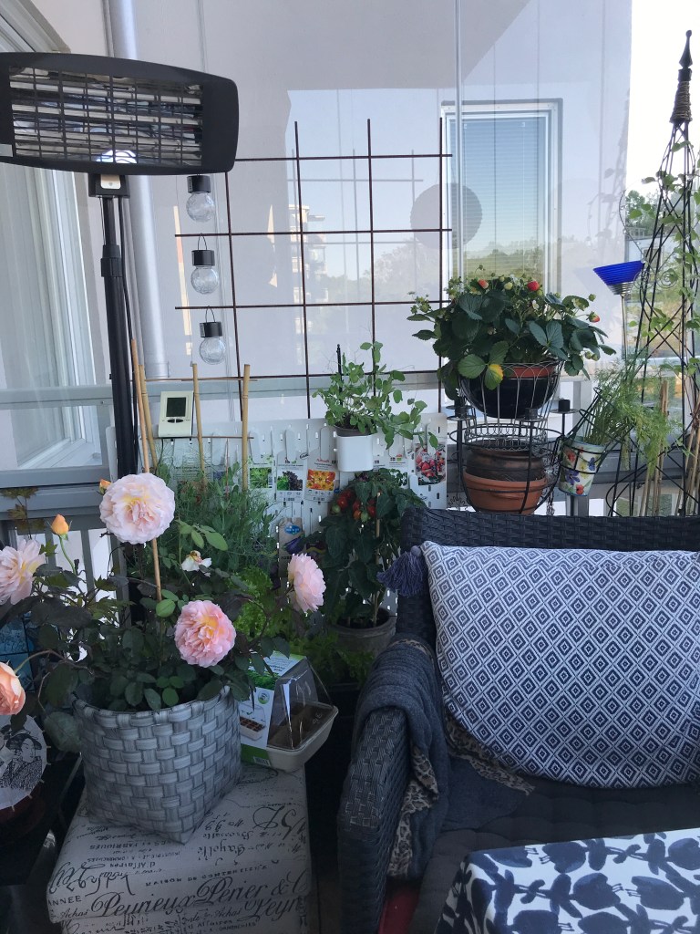 Först idag har ett hörn av balkongen blivit klar. Eller snarare en massa nya härliga växter har flyttat in. I år är det mest ätbart. Förstår att jag inte blir självförsörjande, men att odla ligger ju liksom i tiden. Men en annan viktig faktor är att jag inte kommer att vara bortrest så då kan växterna få sin dagliga omsorg och jag vågar experimentera mer.
