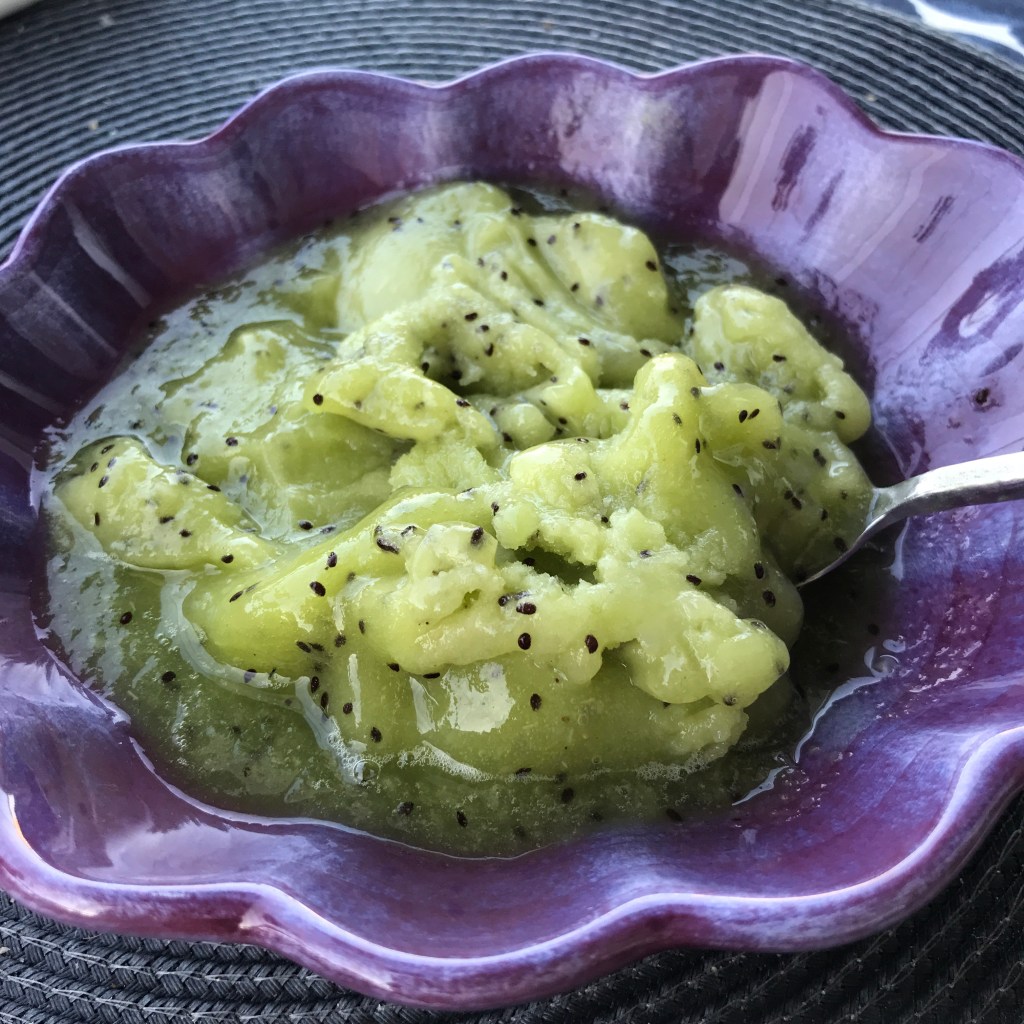 Nu är det varmt ute men skönt att sitta på balkongen i skuggan. Underbart att se alla stora som små på väg ner till Hökarängsbadet som ligger vid sjön Drevviken där jag bor. Fulla av energi på vägen ner men trötta och nöjda på väg hem. En sådan här dag är det svårt att tänka på mat när det jag mest längtar efter är något svalkande. Fixade en läskande kviwisorbet i min lilla glassmaskin. Så gott och passande. Första försöket med glassmaskinen var en vaniljglass som blev underbart god. Nästa projekt blir vaniljglass med Dajmkross.