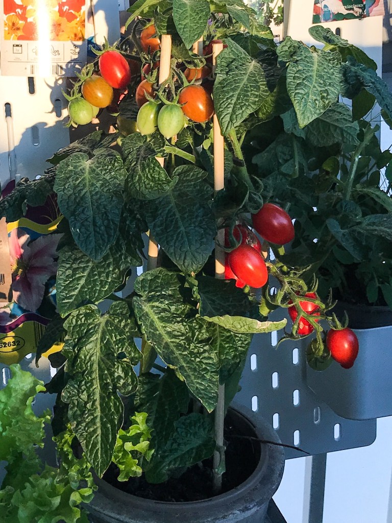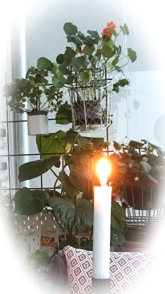 Underbart när växterna tar för sig på olika sätt, med blomprakt eller ”frukt och grönt”. De små lamporna med solceller har tänts. En sommarkväll att minnas.