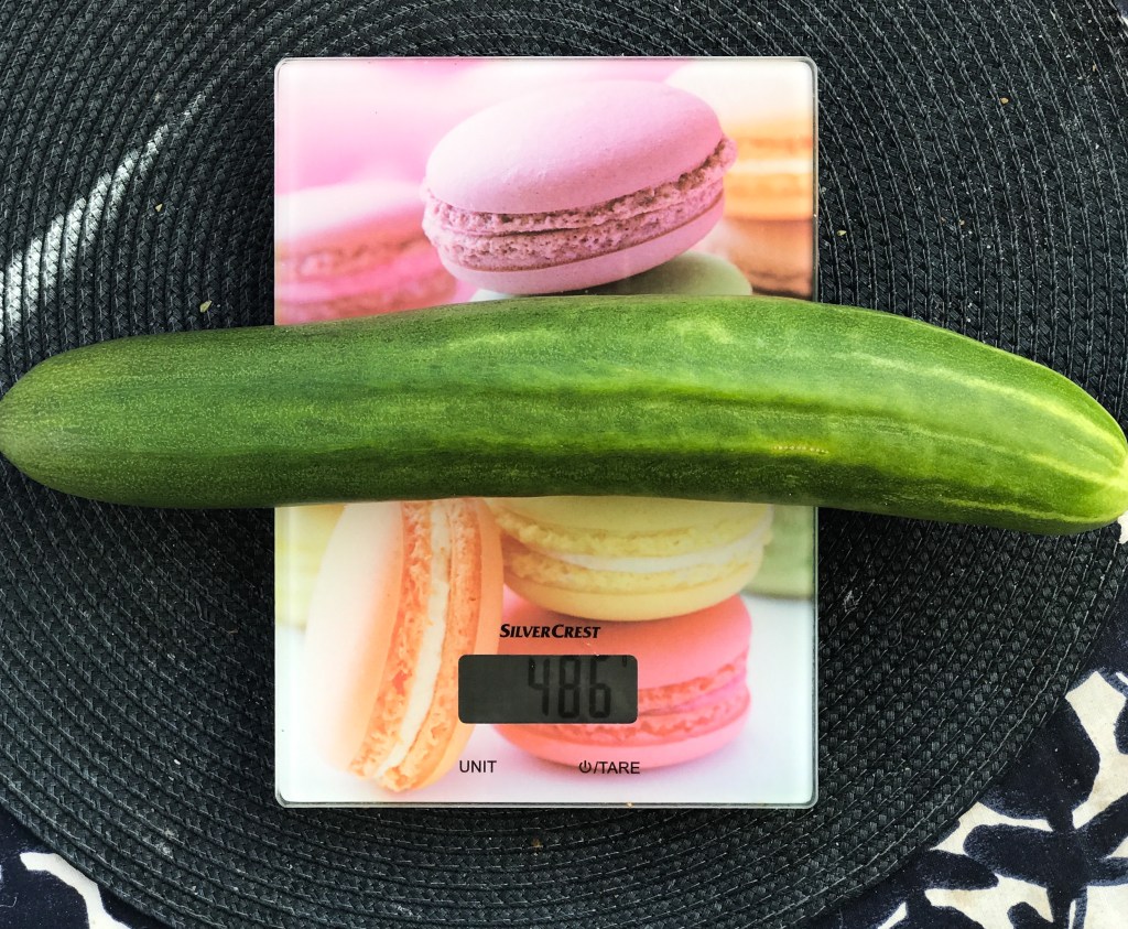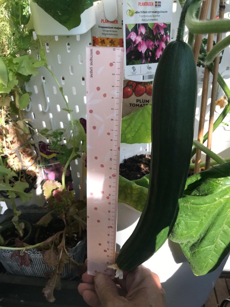 Jag förundras över den växtkraft gurkplantan har. Det som var en liten gurka är idag 25 cm och klar att skörda.