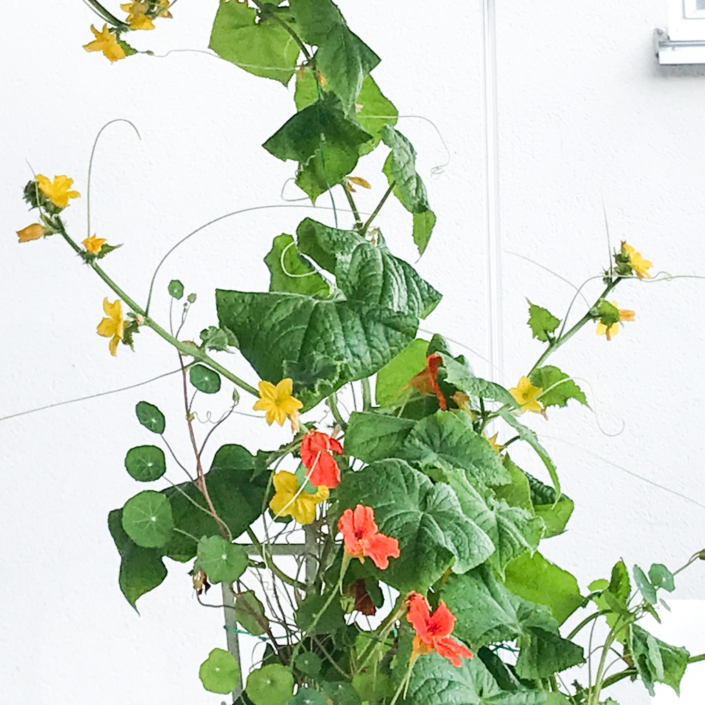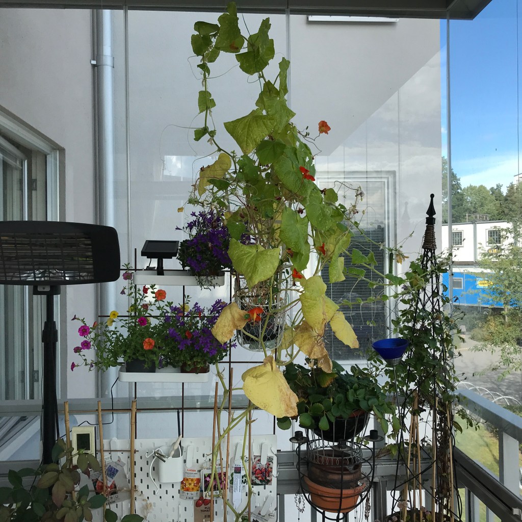 Nu avslutar jag berättelsen om balkongen som en miniträdgård för i år. Att den har haft extra stor betydelse för mig och min familj i dessa Coronatider kan jag inte nog understryka. Växter, både blommor och grönsaker har berikat våra liv. Att se dessa plantor växa och upptäcka hur funktionella växtsätt de uppvisat har roat mig. I topp är gurkplantan som jag fick av min barndomsvän Barbro i början på sommaren. Den har växt och klättrat med sina trådar som helt synligt rörliga letat sig fram till något att fästa sig fast vid. Den har växt ända upp till taket och vänt ner och fäst sina trådar som spiraler för att klara av att det blåser eller att en tung gurka kommer att hänga ner utan att förtöjningen går av. Den har utvecklat stora blad som skyddat frukterna mot den starka solen och blommat med fantastiskt gula blommor. Blommor som till min förvåning plötsligt började växa ut från grenen med en liten gurka på tillväxt. Sex stora gurkor har jag skördat och två små som såg ut som bananer nu på slutet.