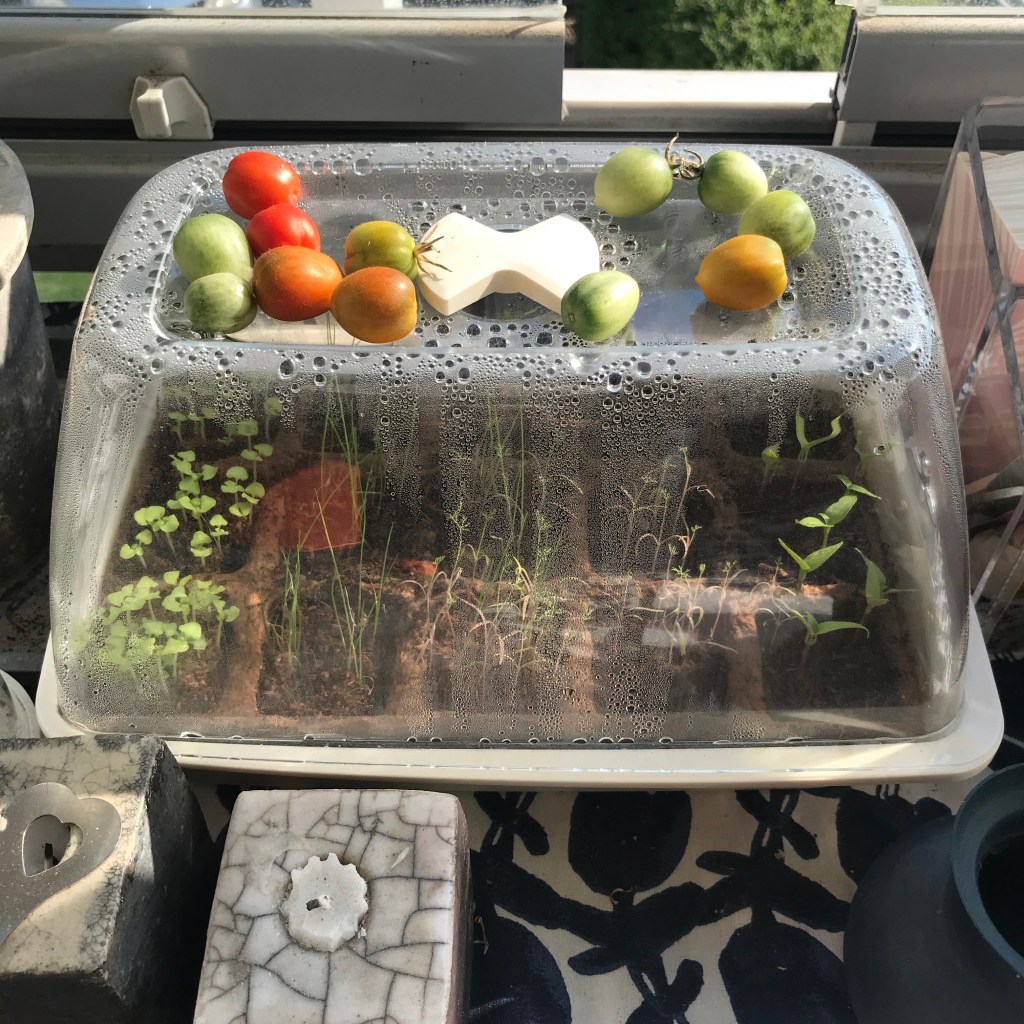 I miniväxthuset växer groddar. Dax att göra en ny gallring. Tomatplantan har fått värmeslag, tror jag, och börjar se dålig ut. Plockar bort de omogna tomater som finns och lägger dem för mognad. Klipper bort det som inte ser friskt ut och ger plantan en ny chans.