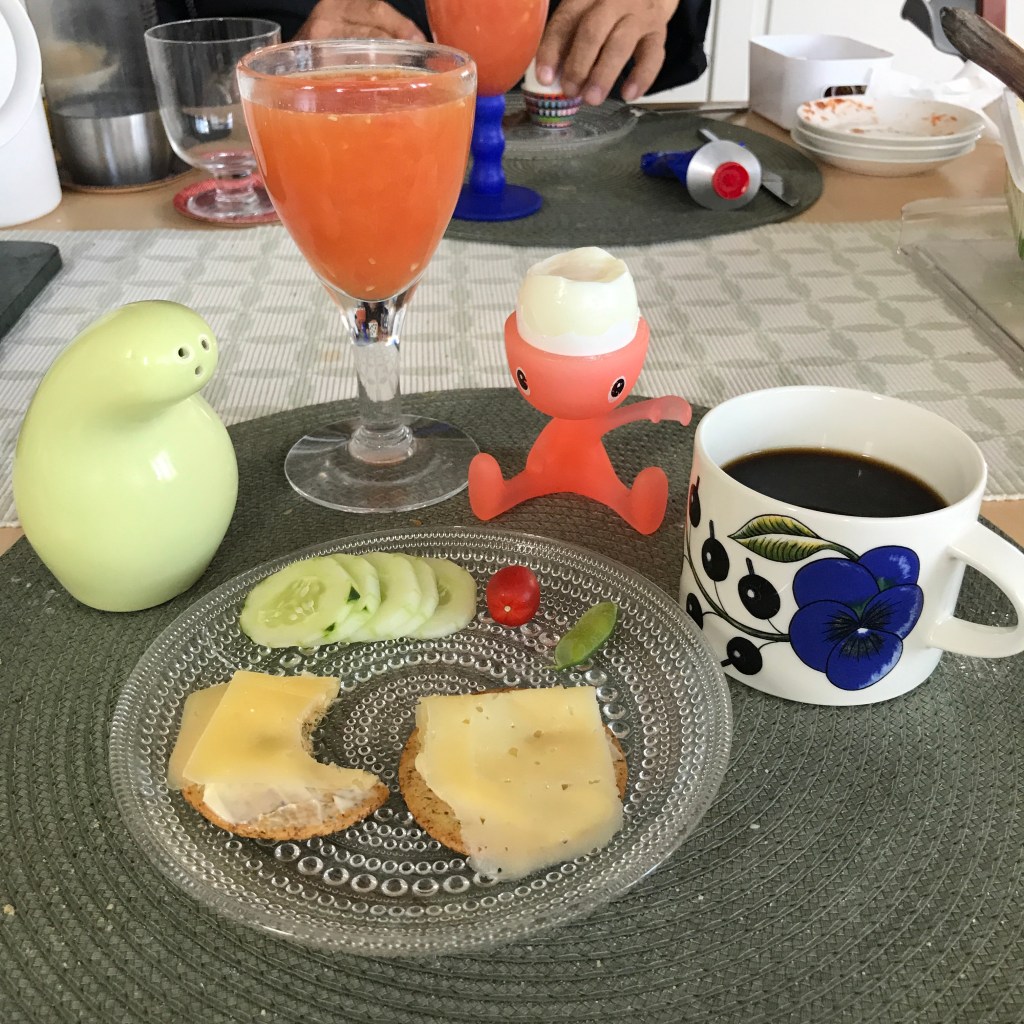 Till frukost får vi nästan varje dag något gott från odlingen på balkongen. Denna morgon blev det gurka, tomat och en miniärtskida men även salladsblad som inte ville vara med på bild.