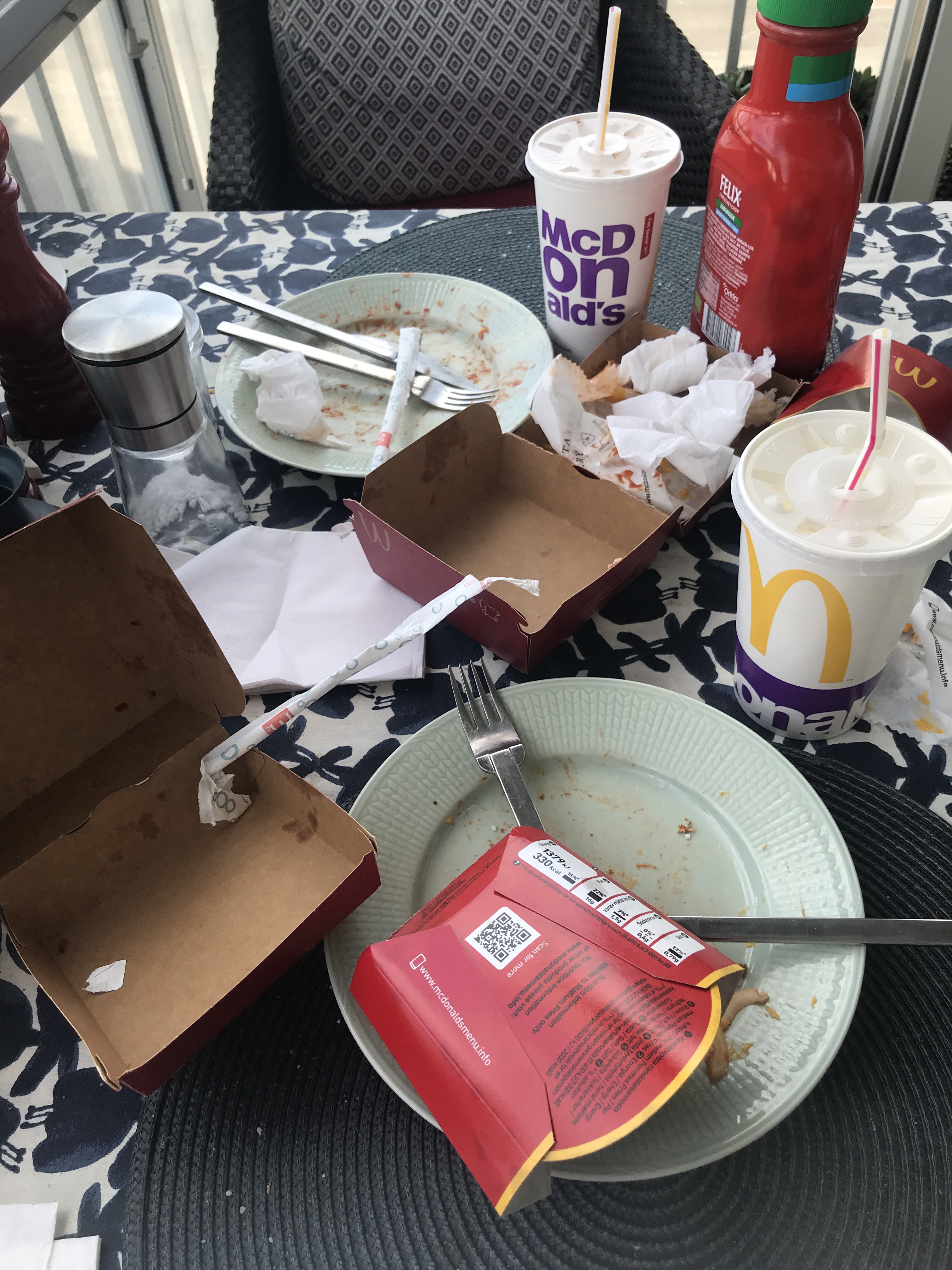 Snabbmat på balkongen. Coronaanpassad leverans i papperskasse genom bilfönstret, blipp på kortläsaren, inga knapptryckningar.