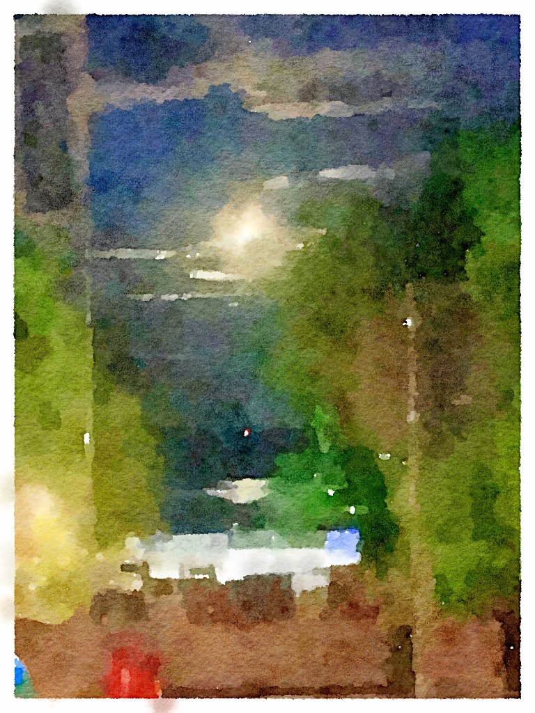 Månsken över Drevviken, foto bearbetat i appen Waterlogue