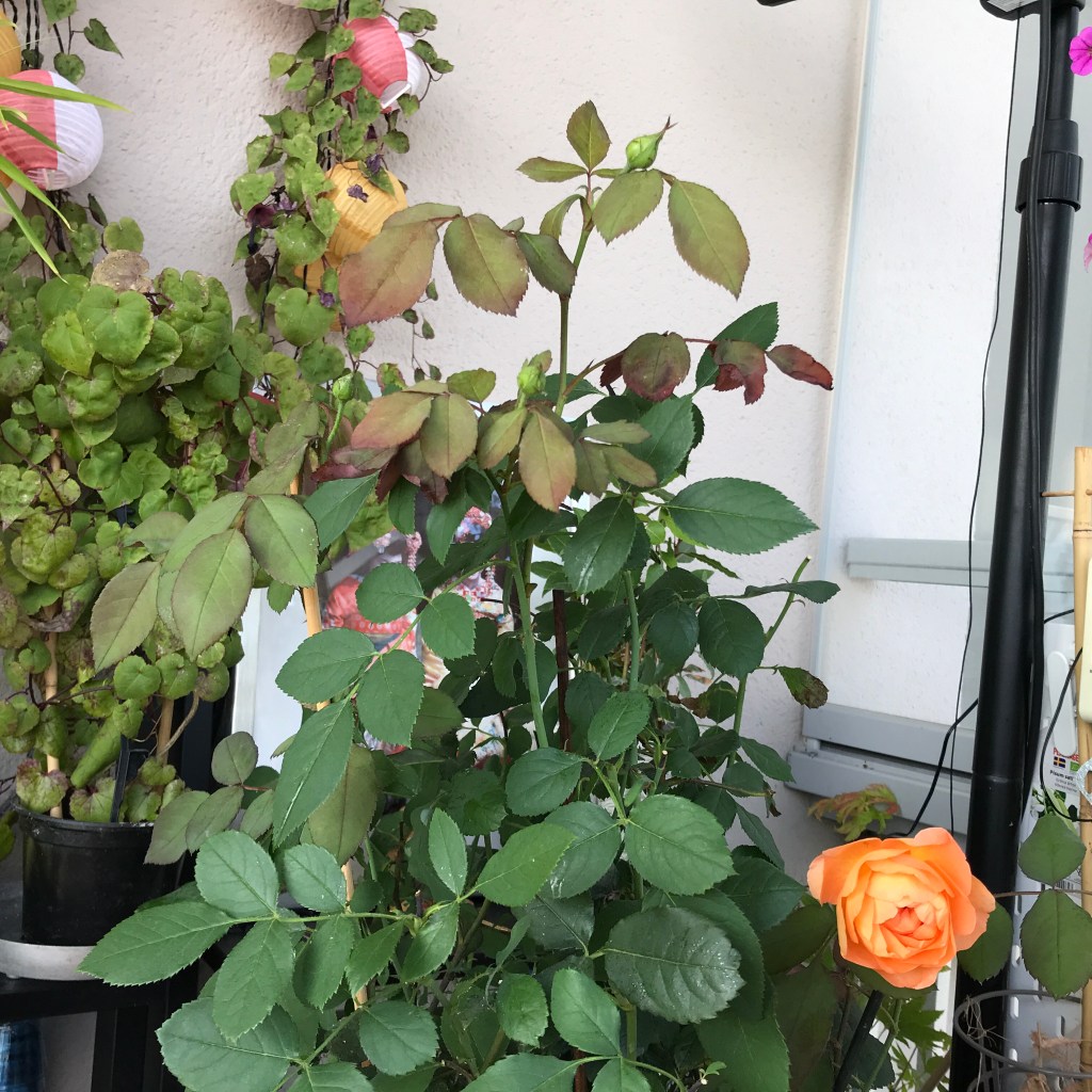 Tillbringar en stund på balkongen när det sakta skymmer. Flyttar fram en krasse, som växt till sig lite undanskymd, till spaljén. Rosen Lady Emma Hamilton blommar ett andra varv nu.